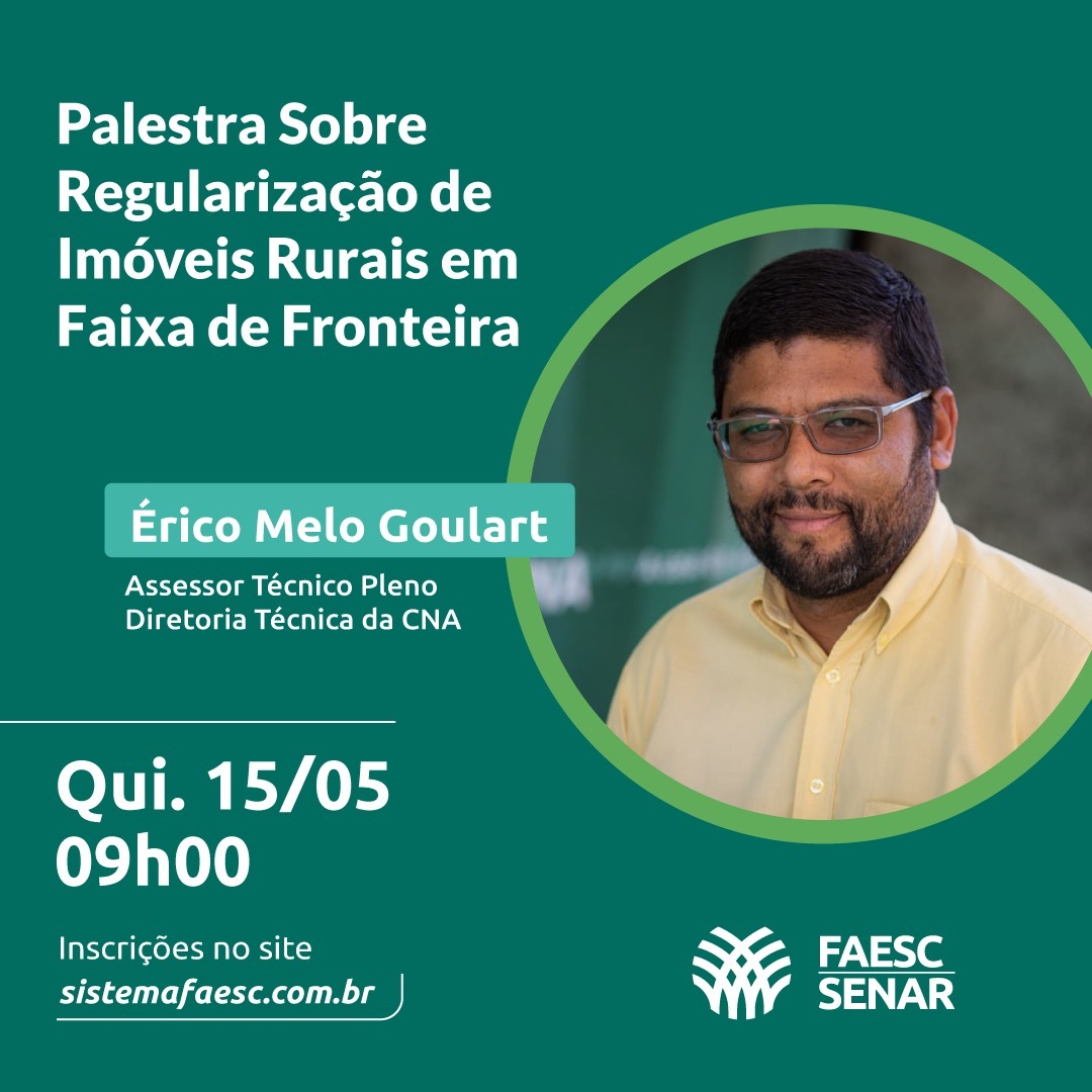 A Confederação da Agricultura e Pecuária do Brasil (CNA) e a Federação da Agricultura e Pecuária do Estado de Santa Catarina (Faesc) realizarão uma palestra virtual com o tema “Regularização de Imóveis Rurais em Faixa de Fronteira”.