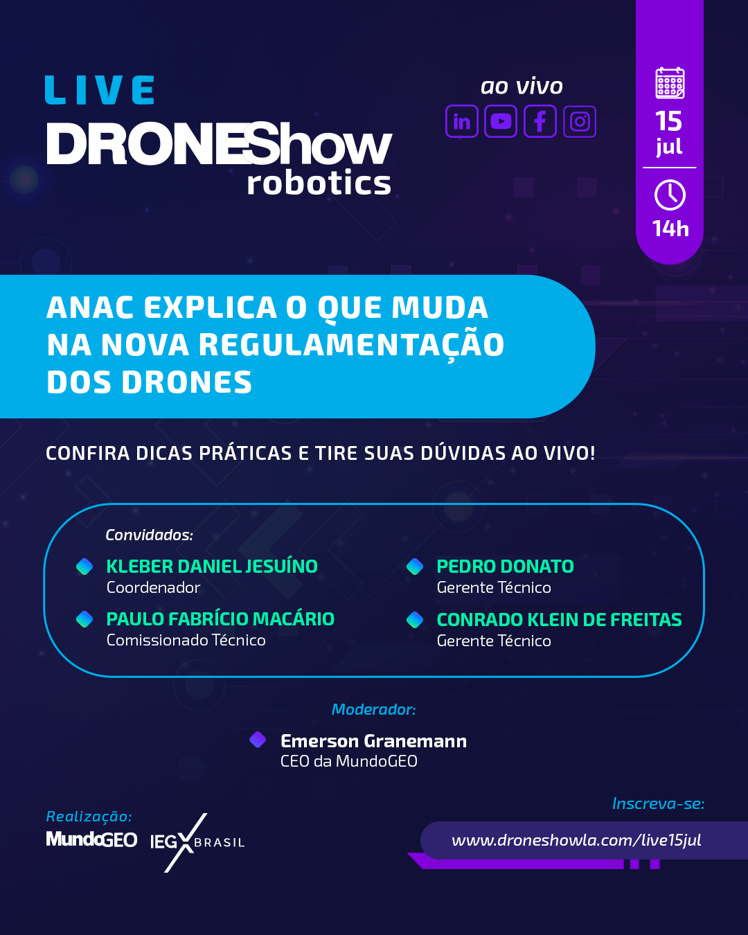 A live ANAC explica o que muda na nova Regulamentação dos Drones será realizada em 15 de julho às 14h (hora de Brasília), com transmissão no YouTube, Linkedin, Facebook e Instagram.