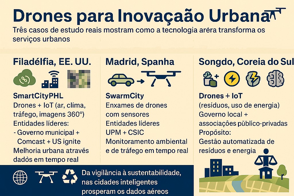 Estudos de caso destacados na literatura incluem o SmartCityPHL, na Filadélfia, que utiliza drones e sensores em postes de iluminação pública para coletar e processar dados ambientais e de mobilidade em tempo real; o SwarmCity, em Madri, que utiliza enxames coordenados de drones com tecnologia de IA para monitorar o tráfego, o congestionamento e a qualidade ambiental; e a iniciativa na cidade de Songdo, Coreia do Sul, que integra drones à infraestrutura inteligente para automatizar a gestão de resíduos.