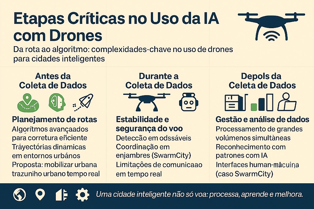 Finalmente, os desafios de interoperabilidade entre múltiplos sistemas devem ser enfrentados, assim como os desafios da operação contínua de drones autônomos em áreas populosas. Aceitar essas complexidades é um preço inevitável a pagar, dada a tecnologia avançada e a coordenação meticulosa que determinam a adoção e a eficácia de projetos complexos em áreas de alta densidade. Em particular, a implementação de inteligência artificial (IA) com drones em projetos atraentes desenvolvidos em grandes cidades enfrenta complexidades que podem ser diferenciadas em três etapas principais do processo de coleta de dados.
