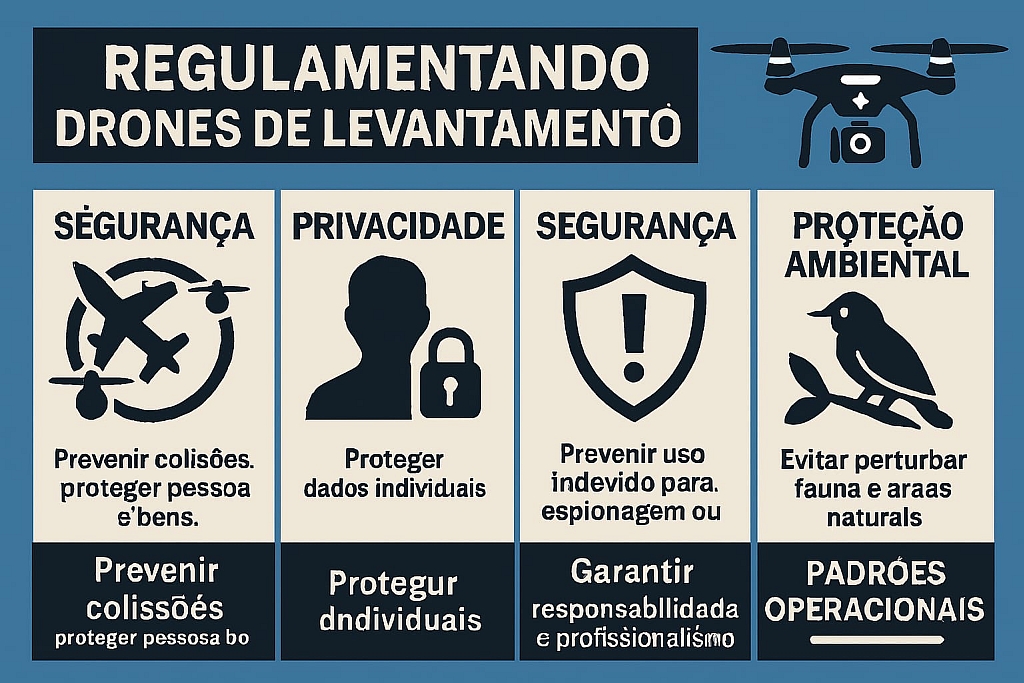 Veículos Aéreos Não Tripulados (VANTs), ou drones, revolucionaram as operações de levantamento ao possibilitar mapeamentos de alta resolução e aquisição de dados de forma eficiente em terrenos diversos. No entanto, o crescimento acelerado da indústria e a integração dos drones nos setores público e privado exigem marcos regulatórios robustos para garantir a segurança, a privacidade e a eficiência operacional.