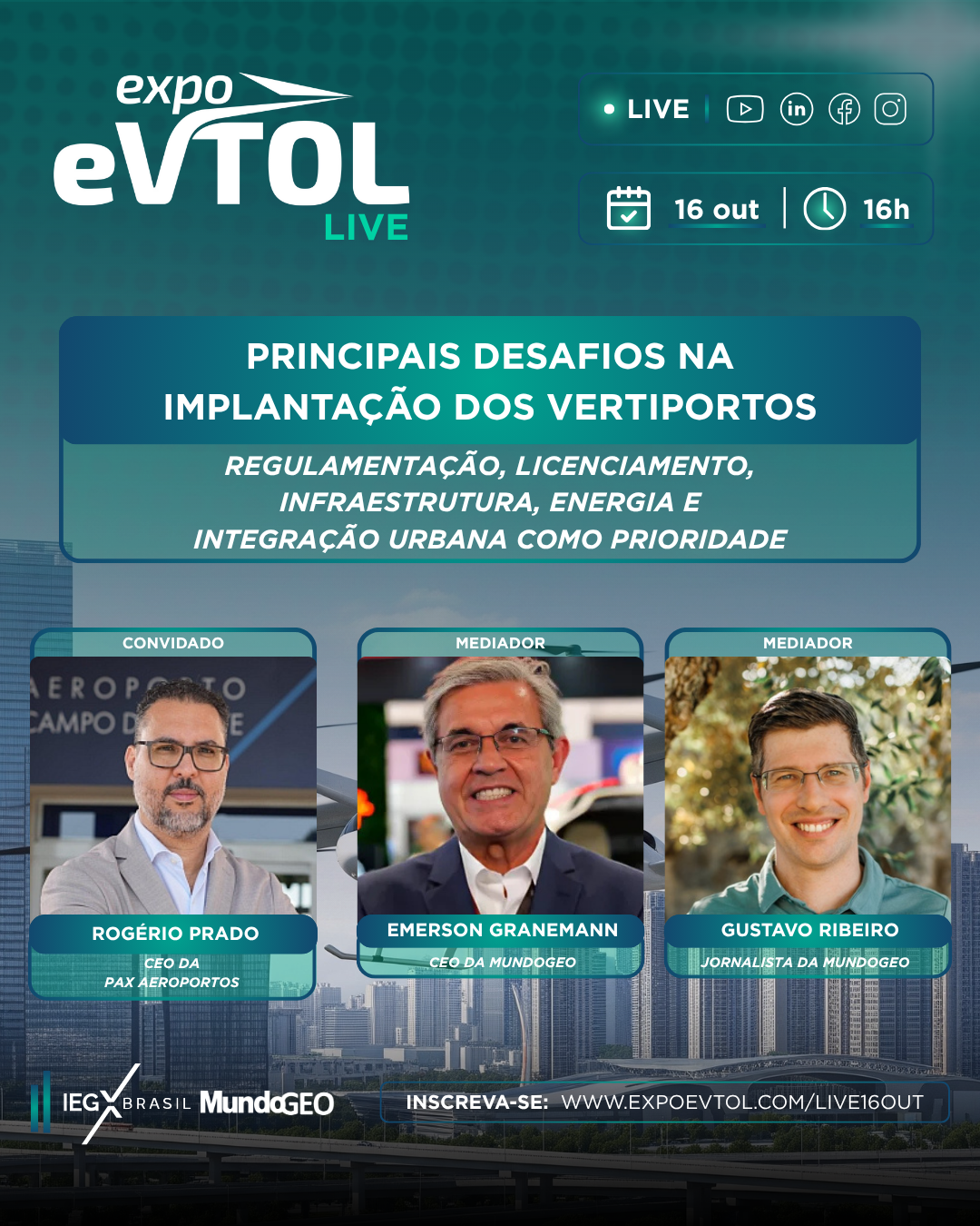A live Principais desafios na implantação dos Vertiportos foi realizada na última quinta-feira (16/10), com transmissão no YouTube, Linkedin, Facebook e Instagram.
