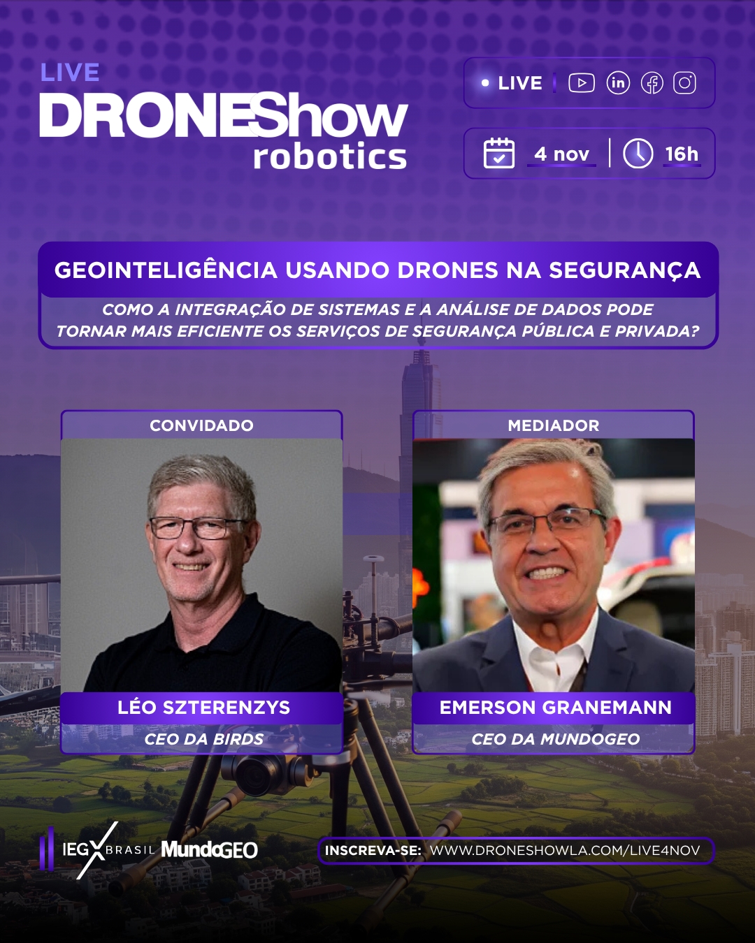 A live sobre Geointeligência usando Drones na Segurança será realizada em 4 de novembro às 16h (hora de Brasília), com transmissão no YouTube, Linkedin, Facebook e Instagram.