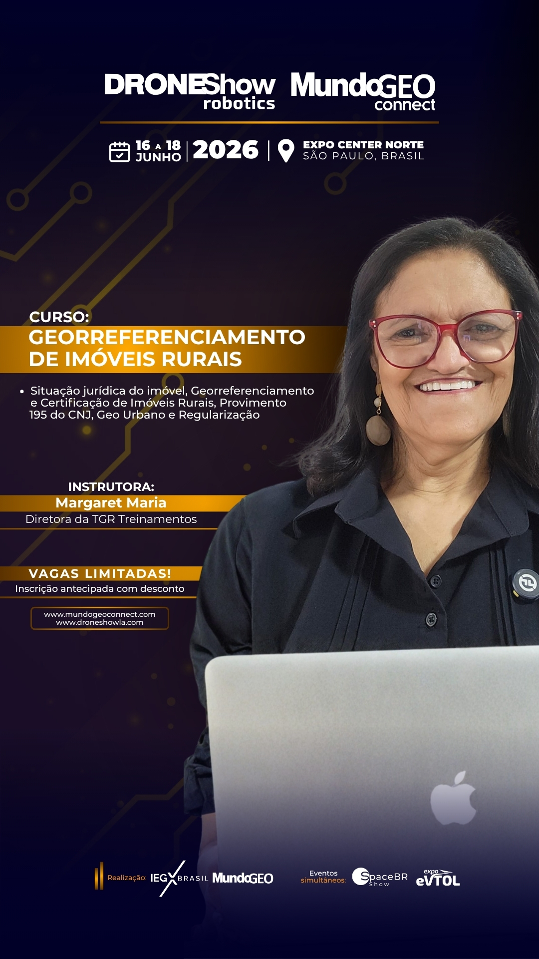 Estão abertas as inscrições antecipadas com desconto no curso Georreferenciamento de Imóveis Rurais, que vai acontecer no MundoGEO Connect 2026, que acontece em paralelo ao DroneShow, SpaceBR Show e Expo eVTOL, de 16 a 18 de junho no Expo Center Norte – Pavilhão Azul, em São Paulo (SP).