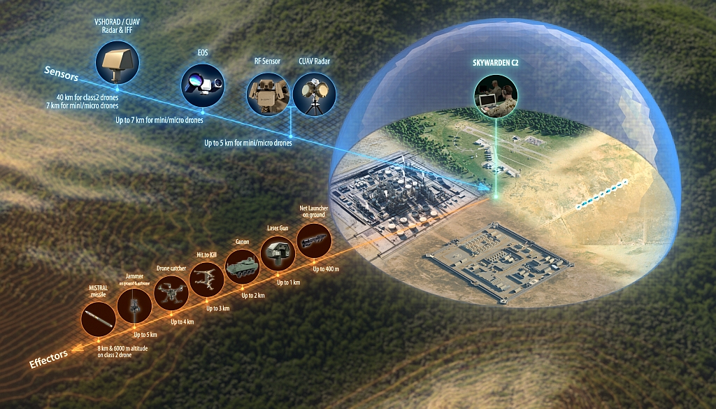 O Sky Warden — pelo qual a MBDA foi premiada pela Agência Europeia de Guarda de Fronteiras e Costeira (Frontex), recebendo o Frontex C-UAS Prize 2025 e sendo declarado o “melhor sistema para proteger as fronteiras da UE” — é um sistema multi-camadas abrangente que protege uma área contra drones desde micro até táticos, a até oito quilômetros de distância. Esta solução é uma evolução e aprimoramento de um sistema de comando e controle (C2) multi-sensor e multi-efetor desenvolvido pela MBDA, que permite a detecção, identificação e classificação de ameaças com precisão graças ao uso de inteligência artificial (IA).