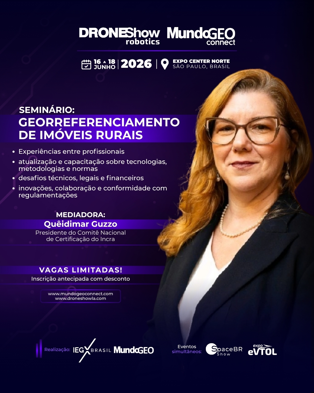 Estão abertas as inscrições antecipadas com desconto no seminário Georreferenciamento de Imóveis Rurais, que vai acontecer no MundoGEO Connect 2026, que acontece em paralelo ao DroneShow, SpaceBR Show e Expo eVTOL, de 16 a 18 de junho no Expo Center Norte – Pavilhão Azul, em São Paulo (SP).