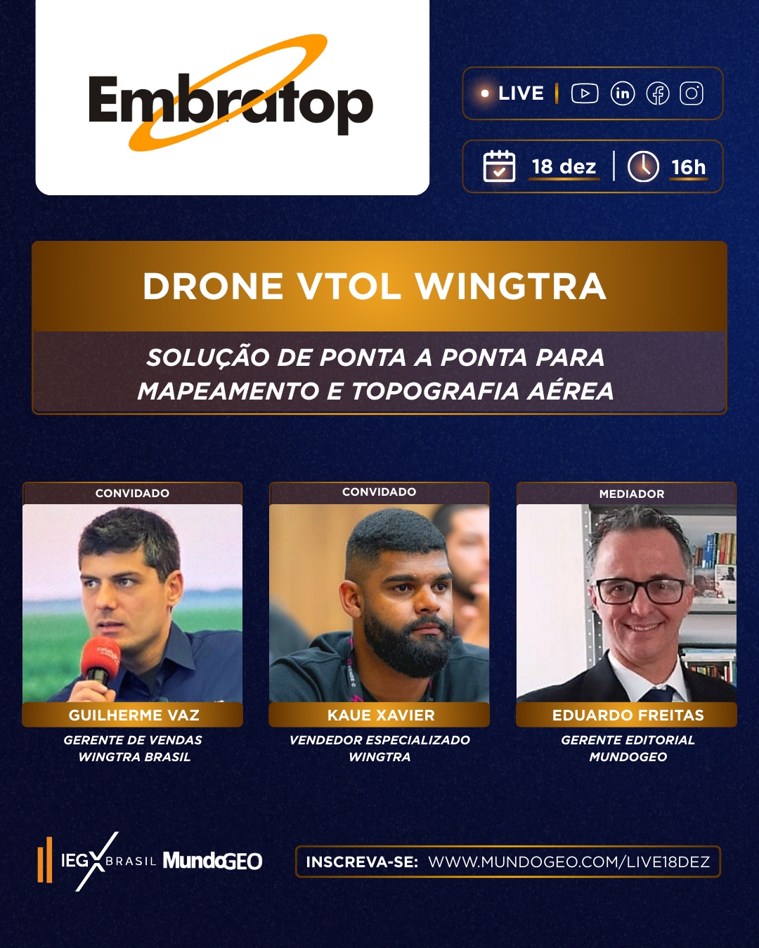 A live sobre o Drone VTOL Wingtra será realizada em 18 de dezembro às 16h (hora de Brasília), com transmissão no YouTube, Linkedin, Facebook e Instagram.