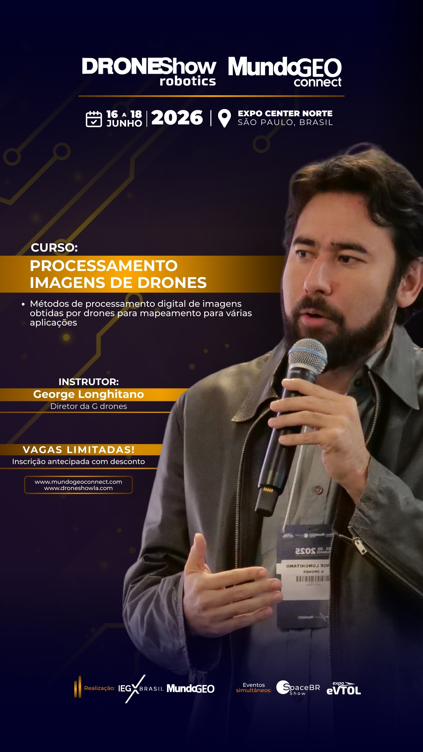 Estão abertas as inscrições antecipadas com desconto no curso Processamento de Imagens de Drones, que vai acontecer no MundoGEO Connect 2026, que acontece em paralelo ao DroneShow, SpaceBR Show e Expo eVTOL, de 16 a 18 de junho no Expo Center Norte – Pavilhão Azul, em São Paulo (SP).