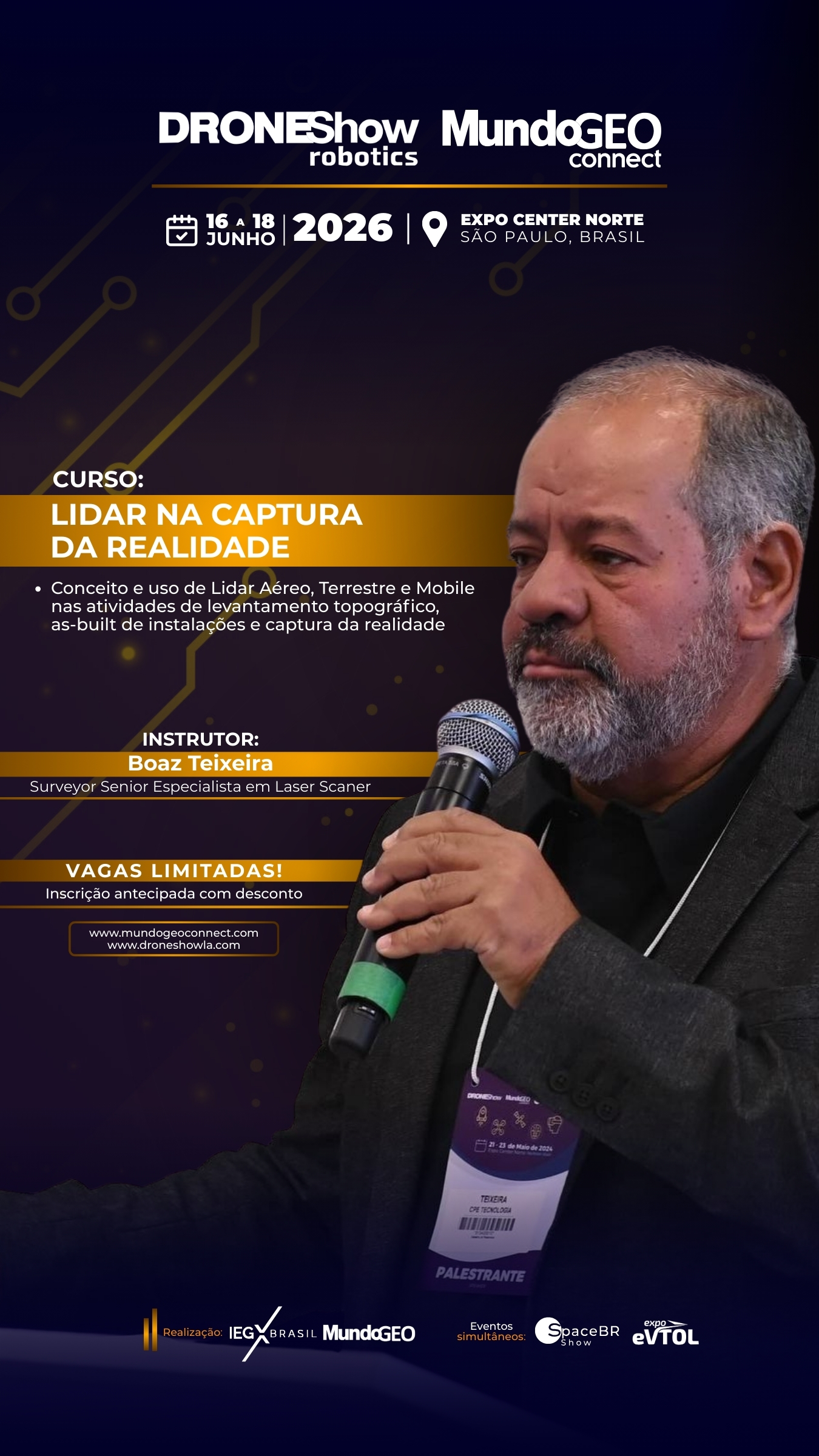 Estão abertas as inscrições antecipadas com desconto no curso Lidar na Captura da Realidade, que vai acontecer no MundoGEO Connect 2026, que acontece em paralelo ao DroneShow, SpaceBR Show e Expo eVTOL, de 16 a 18 de junho no Expo Center Norte – Pavilhão Azul, em São Paulo (SP).