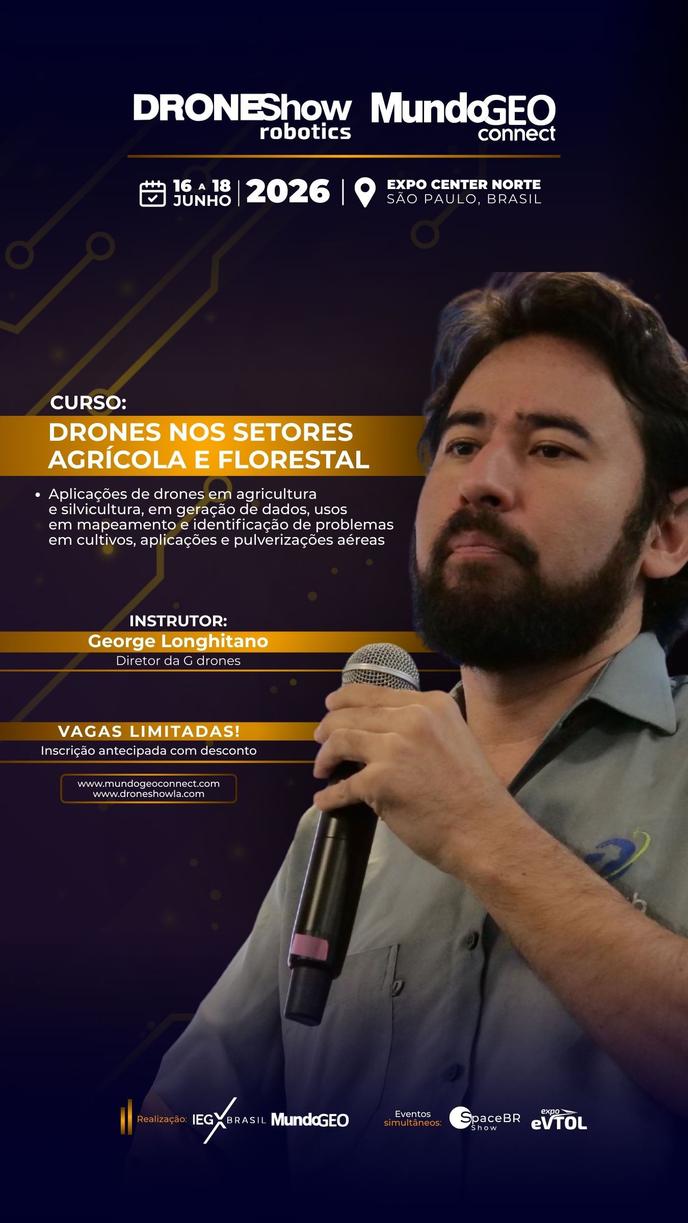 Estão abertas as inscrições antecipadas com desconto no curso Drones nos Setores Agrícola e Florestal, que vai acontecer no MundoGEO Connect 2026, que acontece em paralelo ao DroneShow, SpaceBR Show e Expo eVTOL, de 16 a 18 de junho no Expo Center Norte – Pavilhão Azul, em São Paulo (SP).