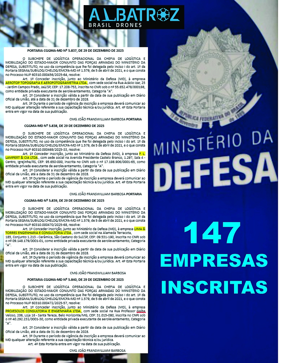 O fechamento de 2025 foi marcado por um resultado simbólico e relevante. Em 30 de dezembro, último dia útil do ano, foram publicadas no Diário Oficial da União (DOU) as portarias de inscrição de quatro empresas de aerolevantamento no Ministério da Defesa. Todas estas empresas tiveram seus processos conduzidos com assessoria da Albatroz Brasil Drones.