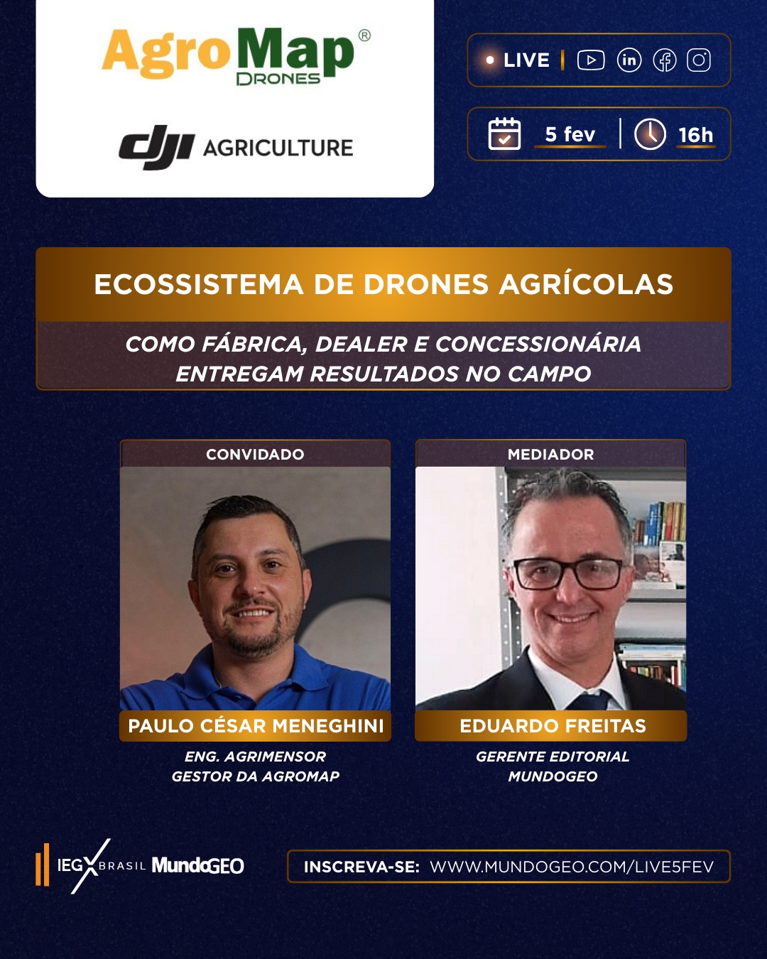 A live sobre o Ecossistema de Drones Agrícolas será realizada em 5 de fevereiro às 16h (hora de Brasília), com transmissão no YouTube, Linkedin, Facebook e Instagram.