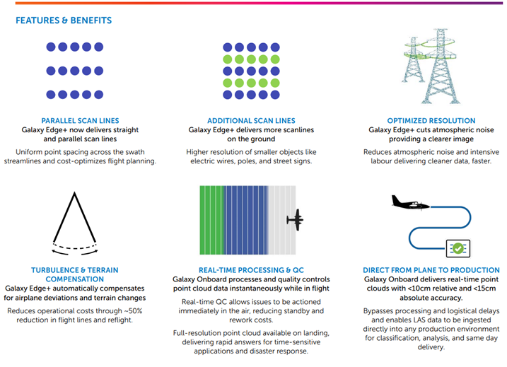 Entre as diversas aplicações do Galaxy Edge+, destaca-se o monitoramento de vegetação em faixas de linhas de transmissão e distribuição de energia, permitindo identificar e mapear potenciais causas de desligamentos nas redes elétricas. A alta densidade de pontos possibilita a detecção e representação espacial de pequenos elementos, como cabos de linhas de distribuição, que muitas vezes não são captados por sensores convencionais.