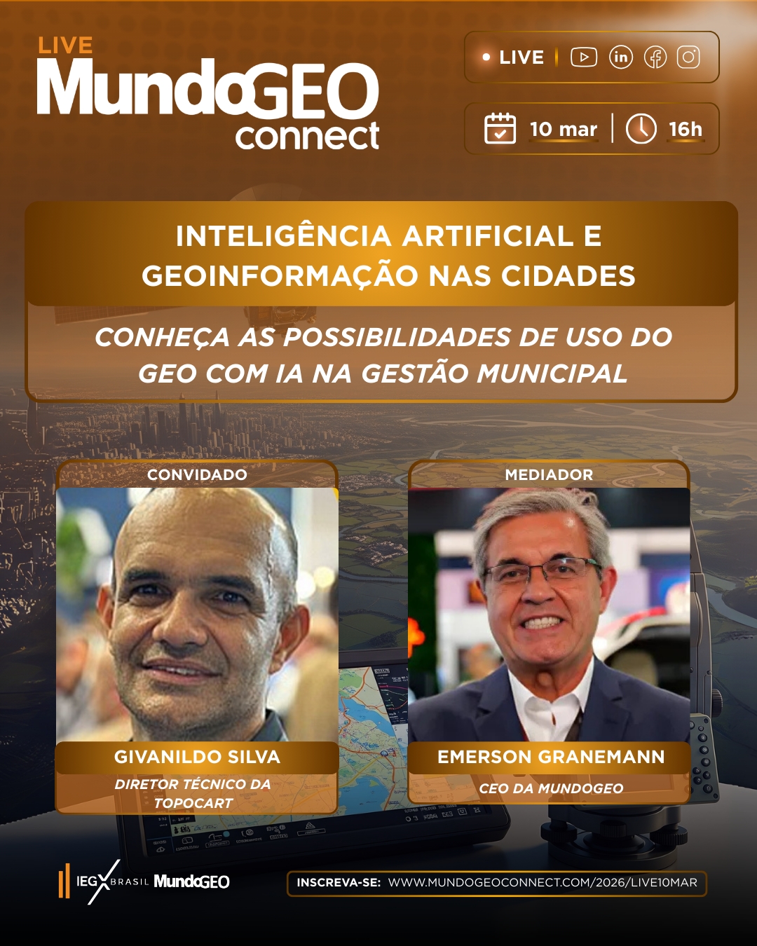 A live sobre Inteligência Artificial e Geoinformação nas Cidades será realizada em 10 de março às 16h (hora de Brasília), com transmissão no YouTube, Linkedin, Facebook e Instagram.