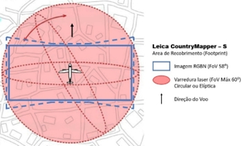 A Leica DMC-4 é uma câmara aérea de grande formato, lançada em 2022, para aquisição somente de imagens. O Leica CountryMapper, que foi lançado quase dois anos depois, é uma evolução da DMC-4 pois, além da aquisição de imagens multiespectrais, ele coleta também dados laser, ou seja, um sistema híbrido. Sua configuração é o equivalente a uma DMC acrescida de um sensor LiDAR de alta performance. As imagens multiespectrais são coletadas com tamanho de 423 megapixels e os dados laser são coletados com o sensor Hyperion3, de frequência de pulso de 2.000 kHz, ângulo de abertura mais flexível, divergência de pulso de 0,17 mrad com maior capacidade de penetração, precisão planimétrica, produtividade e flexibilidade em relação ao seu antecessor Hyperion2+, sensor que já operamos desde 2022. O ângulo de abertura da câmara aérea (FoV – Field of View) é de 58 graus, e o laser tem abertura variável de 10 à 60 graus. Ou seja, na prática, pode-se ter o mesmo campo de visão para imagem e laser, além de que a coleta laser pode ser alterada do modo circular para o elíptico e ainda ser rotacionada, o que dá grande flexibilidade na varredura. A figura acima mostra esquematicamente a área de recobrimento, o “footprint”, do CountryMapper-S.