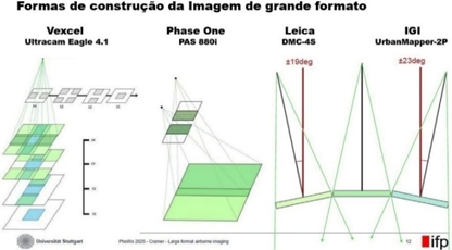 A maioria dos atuais sistemas de imageamento de grande formato utilizam dois ou mais sensores CMOS, hoje ainda limitados a 150 megapixels, para a construção da imagem de grande formato, que pode chegar a um tamanho de até 508 MP. Cada fabricante adota uma maneira distinta de combinar lentes e sensores CMOS em uma geometria que permita a obtenção do quadro final da imagem. A Vexcel desde sua primeira câmara, lançada em 2003, adota o conceito Sintópico (syntopic) que consiste em combinar nove sensores em quatro lentes com visadas nadirais de maneira a formar o quadro pancromático, e mais quatro conjuntos de sensores de menor resolução e lentes independentes para a obtenção das bandas R, G, B e IR, depois faz o “panshapening” com essas imagens; entretanto, para a UltraCam Merlin, adotou mais recentemente uma variação na forma de aquisição, usa duas lentes nadirais e três sensores RGB para adquirir a imagem resultante, e mais dois conjuntos de lentes e sensores para a banda IR. A PhaseOne utiliza um conceito semelhante, mas com duas lentes e dois sensores RGB, com a possibilidade adicional de coleta da banda Infravermelha com o emprego de mais um conjunto de sensor e lente. A Leica, que já foi um importante fabricante de lentes, hoje somente projeta, mas de forma única e exclusiva, as lentes empregadas em seus sistemas, e tem uma abordagem também distinta, explora muito bem a melhor qualidade e região da lente, o “Sweet-Spot”, para o posicionamento do sensor imageador. No CountryMapper, e na DMC-4, é utilizado o conceito “borboleta” com um conjunto de lente e sensor RGB de visada nadiral e mais dois conjuntos laterais, com uma pequena faixa de superposição, com visadas ligeiramente inclinadas de 19 graus; com isso, utiliza três sensores para a construção da imagem sintética de 423 megapixels; e mais dois sensores, menos inclinados, para a coleta da banda espectral Infravermelha; e, usando sua própria rotina de interpolação, gera imagens multiespectrais nas quatro bandas. Ou seja, cada um desses três importantes fabricantes tem uma forma distinta de criar a imagem de grande formato. A figura acima mostra esquematicamente como é gerada a imagem resultante de quatro sistemas.