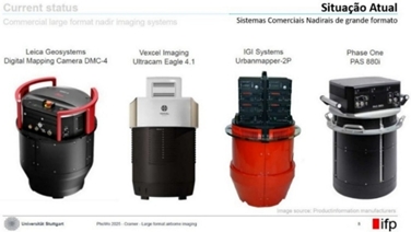 Todos esses recursos tecnológicos aportados nas últimas gerações dos sistemas de imageamento visaram a ganhos não só em precisão e qualidade, mas também e principalmente em produtividade e flexibilidade. À medida em que surgem evoluções ou mudanças tecnológicas nos principais insumos como, por exemplo, nos sensores imageadores, algumas soluções técnicas precisam ser implementadas ou, mesmo, readaptadas para contornar os obstáculos, gerados por essa evolução, para a construção de um novo sistema ou câmara aérea. Um bom exemplo disso é o conceito FMC para a compensação do arrastamento da imagem, inventado nos anos 80 pela Zeiss – hoje Hexagon/Leica, e usado até os dias atuais, claro que com as constantes e necessárias adaptações que o ambiente digital e sua evolução exigiram. Os novos sensores de imagem com o tamanho do pixel reduzido passaram a exigir também lentes mais adequadas a essa condição, principalmente para o uso aerofotogramétrico. Outro exemplo a ser citado é que sensor de imagem com matriz de Bayer já foi, no passado, exclusividade das câmaras aéreas de médio formato e agora, após as últimas evoluções, faz parte também de vários sistemas de grande formato. Resumidamente esses são, hoje, os principais e necessários recursos de uma câmara aérea para uso fotogramétrico: alta resolução e sensibilidade do sensor; capacidade de obtenção de imagens espectrais com qualidade; apropriada relação PAN/NIR ou RGB/NIR; calibração geométrica e radiométrica; dispositivo adequado de compensação do arrastamento da imagem; plataforma giroestabilizadora; pequeno intervalo de tempo entre imagens consecutivas, entre outros não menos importantes. De acordo com o prof. Michael Cramer, do ifp – Instituto de Fotogrametria, da Universidade de Stuttgart, a qualidade dos produtos finais do mapeamento depende também de outros fatores que vão além da qualidade da câmara aérea ou da imagem gerada por ela. Condições meteorológicas favoráveis, bons softwares de processamento e a experiência de toda a equipe envolvida são também fundamentais.