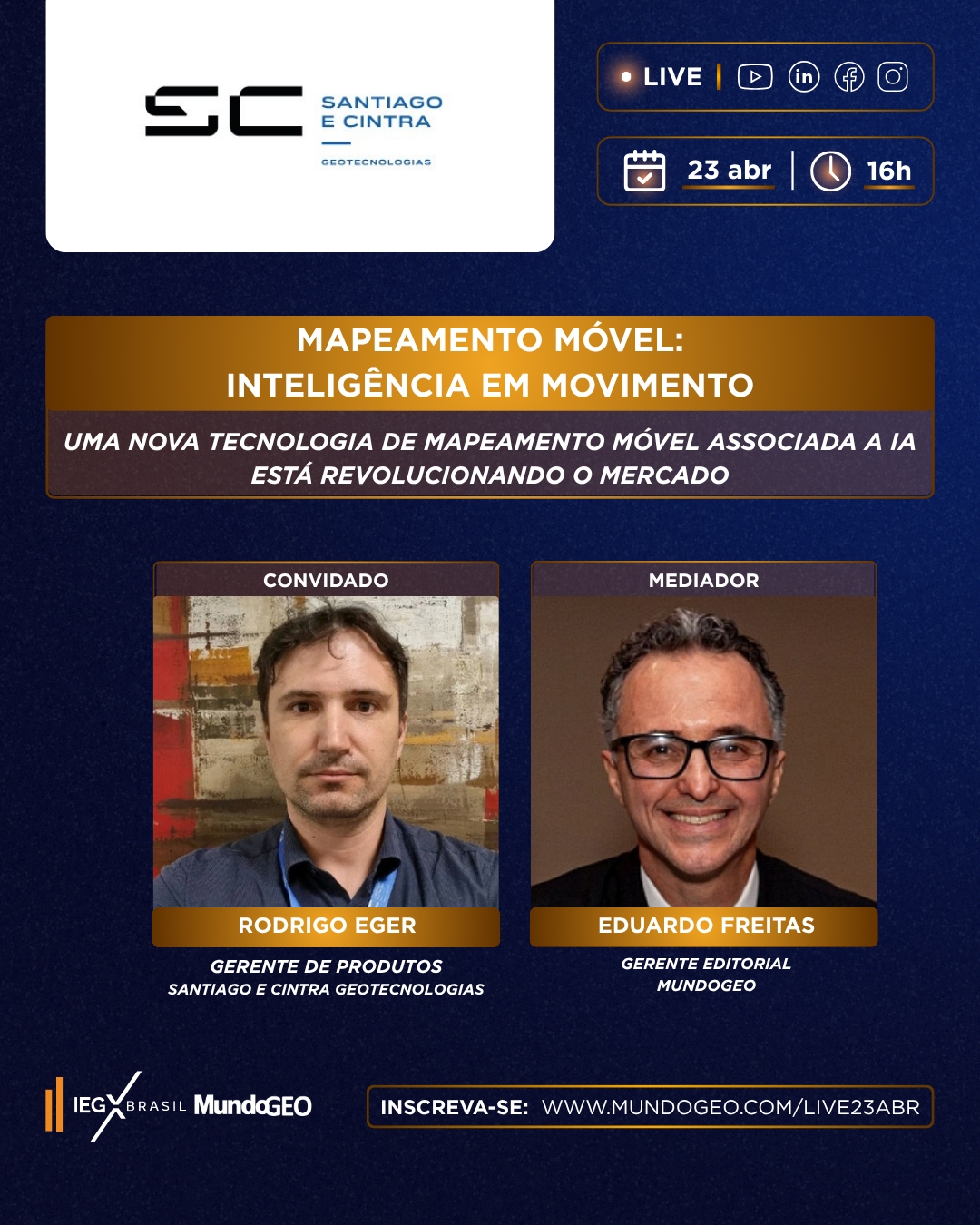 A live Mapeamento Móvel – Inteligência em Movimento será realizada em 23 de abril às 16h (hora de Brasília), com transmissão no YouTube, Linkedin, Facebook e Instagram.