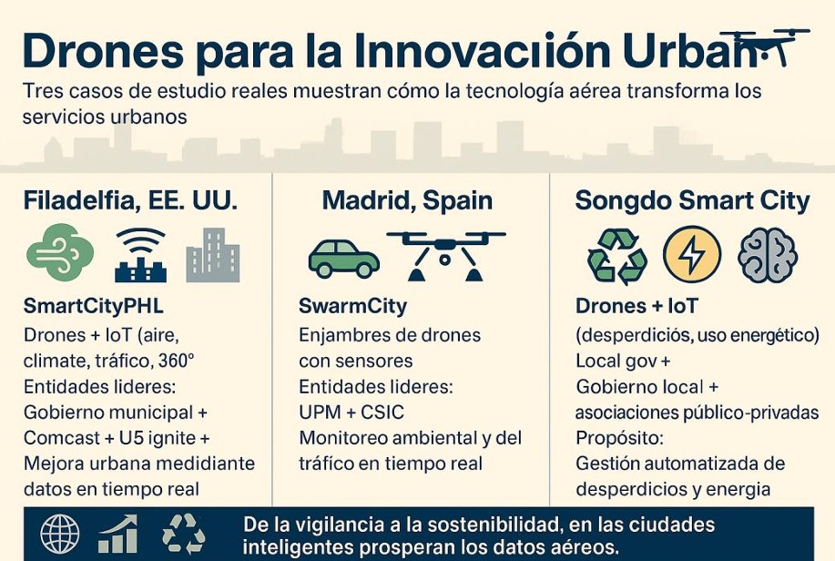 Entre los casos que se destacan en la literatura se encuentran SmartCityPHL en Filadelfia, que emplea drones y sensores en alumbrado público para recopilar y procesar datos ambientales y de movilidad en tiempo real; SwarmCity en Madrid, que utiliza enjambres coordinados de drones con IA para supervisar tráfico, aglomeraciones y calidad ambiental; y la iniciativa en la ciudad de Songdo en Corea del Sur, que integra drones en una infraestructura inteligente para automatizar la gestión de residuos.