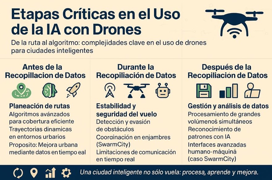 Finalmente, se deben abordar los retos en la interoperabilidad entre múltiples sistemas, y resolver los desafíos de la operación autónoma continuada de drones en áreas pobladas. Asumir estas complejidades constituye el precio inevitable a pagar, dada la avanzada tecnología y la meticulosa coordinación que condicionan la adopción y efectividad de proyectos complejos en zonas de alta densidad poblacional. En particular, la implementación de inteligencia artificial (IA) con drones en atractivos proyectos desarrollados en grandes ciudades enfrenta complejidades que pueden ser diferenciadas en tres etapas principales del proceso de levantamiento de datos.